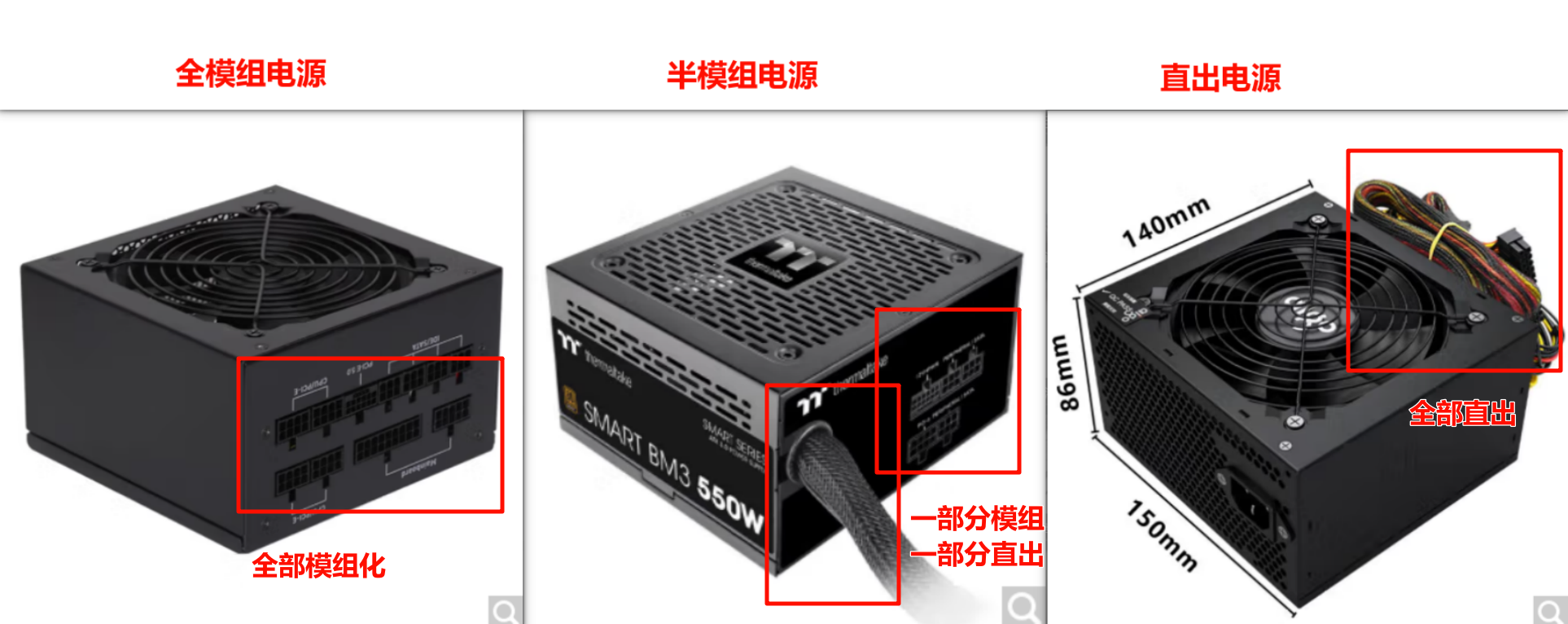 | 所有线材均可自由插拔,想用几根就插几根 | 直出和全模组的结合体。一般主板24pin供电线、cpu供电线从电源直出;其他模组化 | 所有线材直接从电源内部出来,不能改动 |