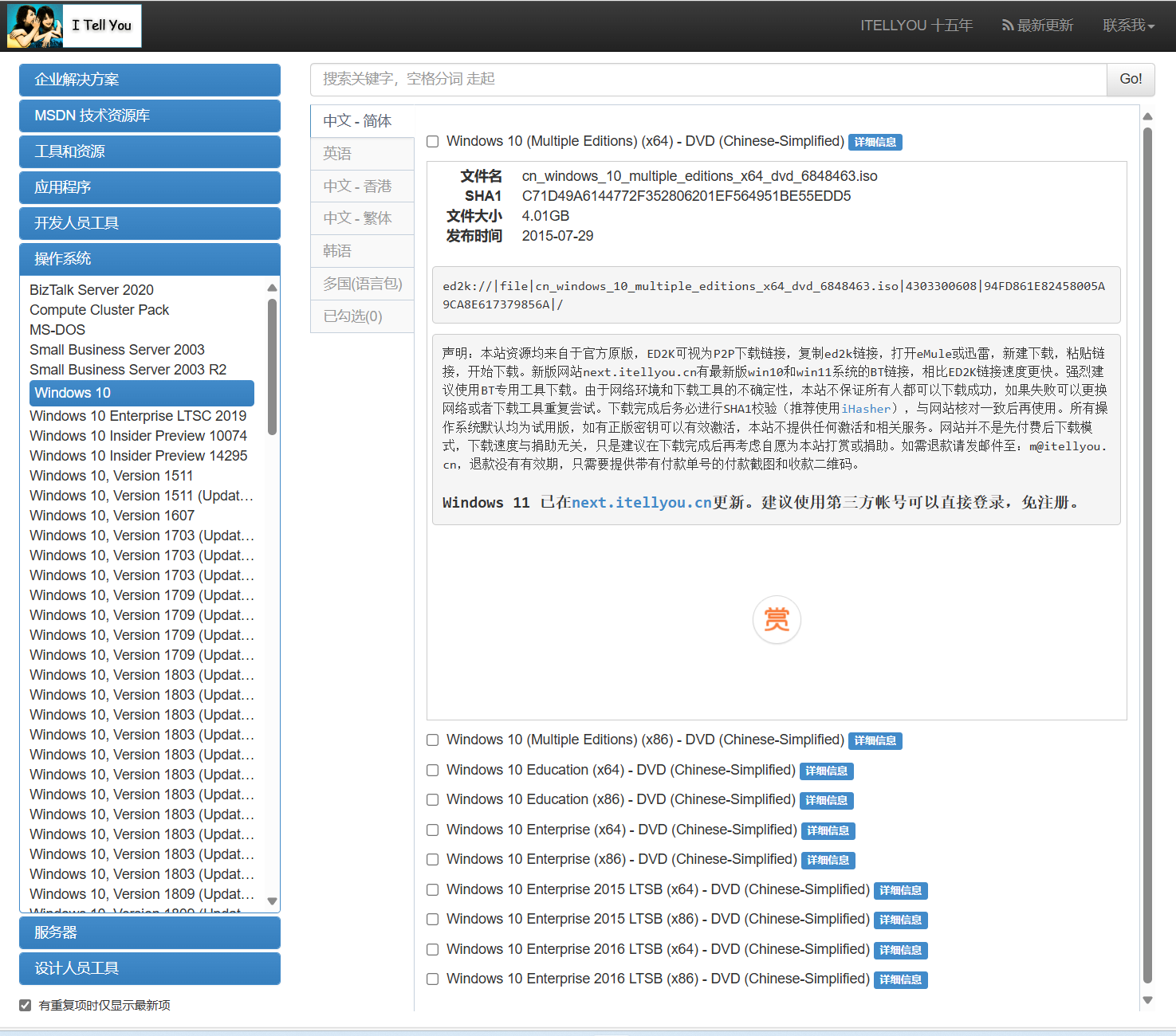 浏览器打开网站后,在左侧点击操作系统,在列表中选择一个操作系统,然后在右侧点开详细信息,将ed2k的链接复制到迅雷等软件中即可下载