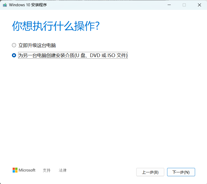 点击选择“为另一台电脑创建安装介质(U盘、DVD或ISO文件)”并点击下一步