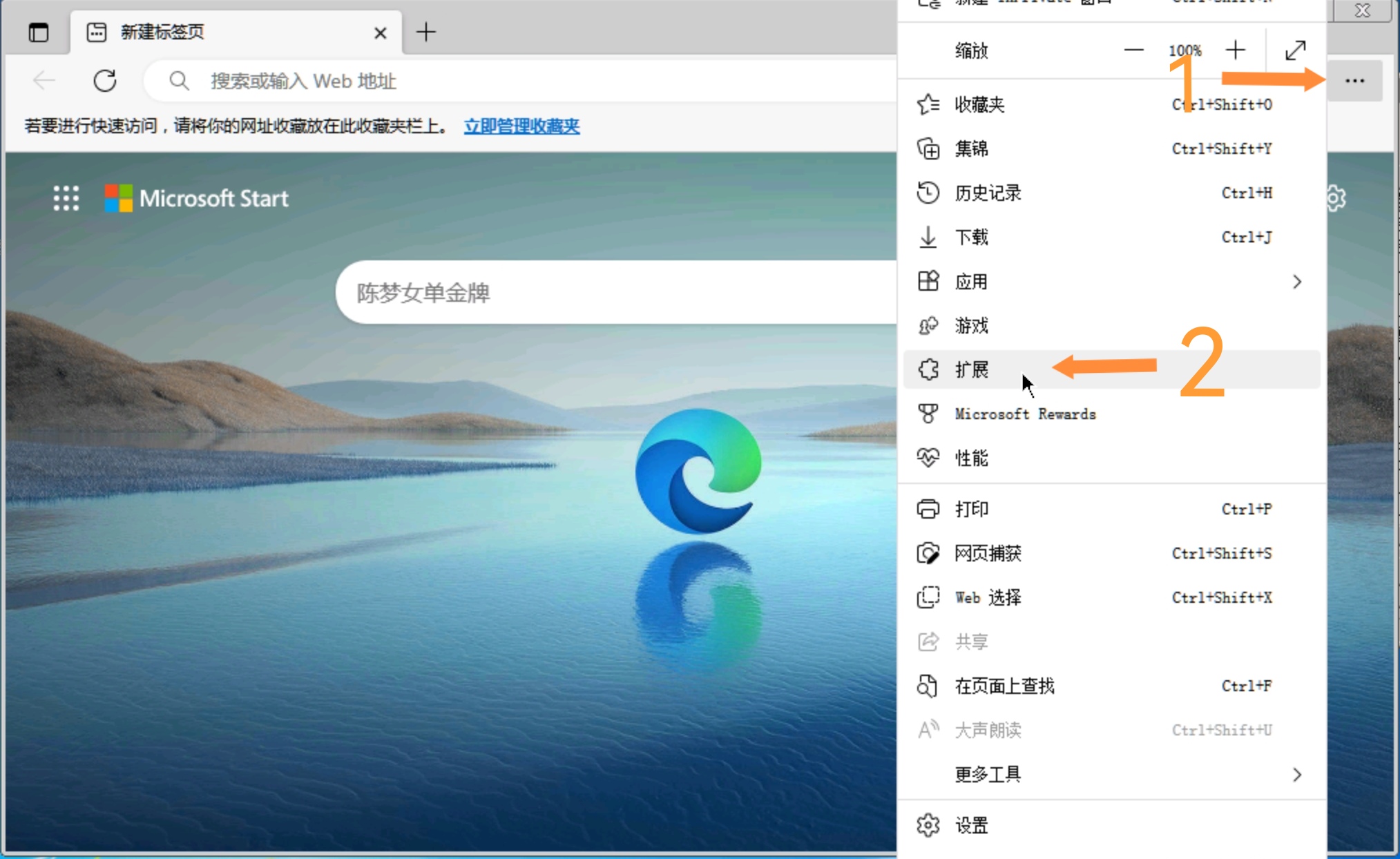打开浏览器,在没有安装扩展的情况下,你需要先点击右上角的 三点 ,再点击 “扩展”。