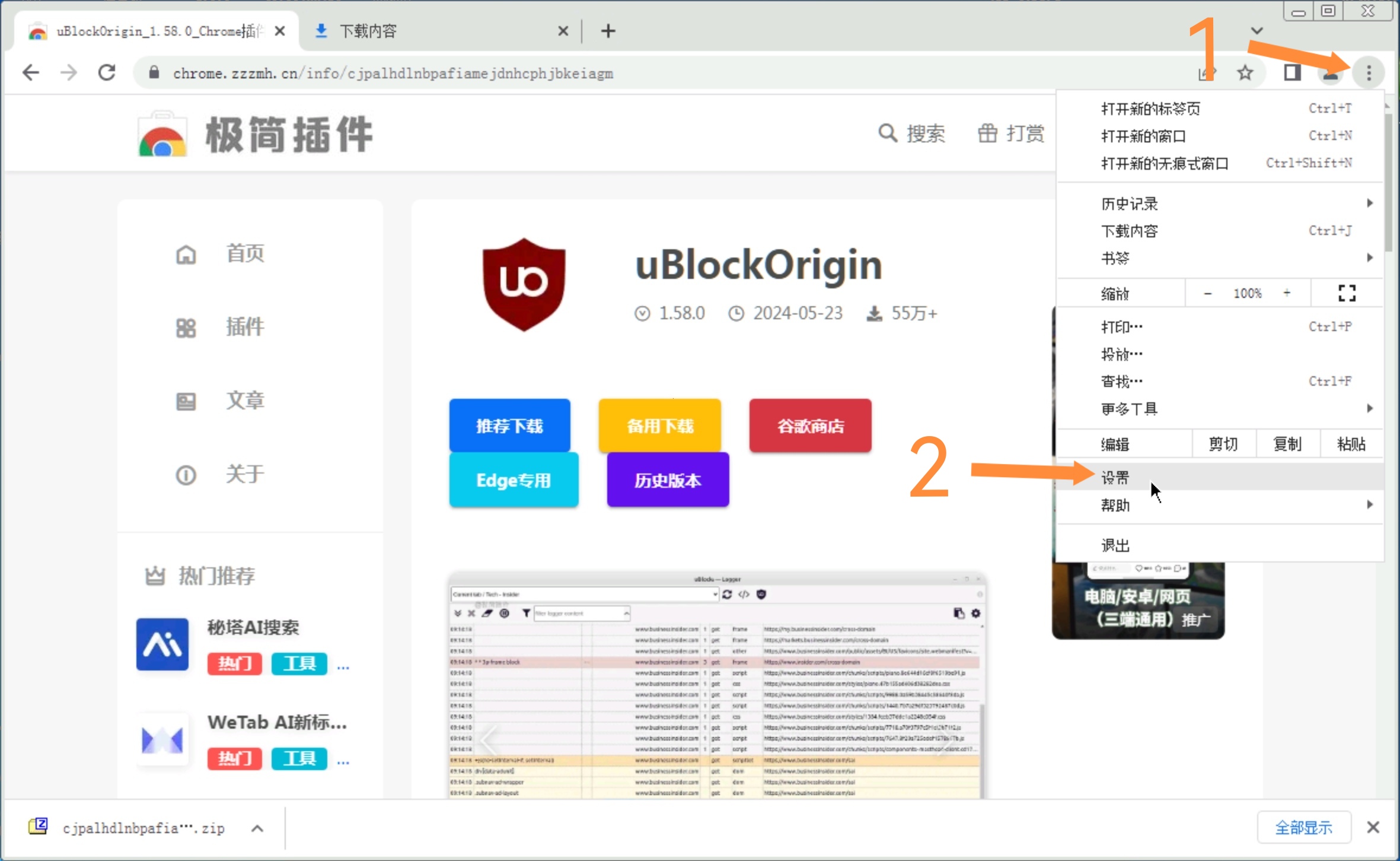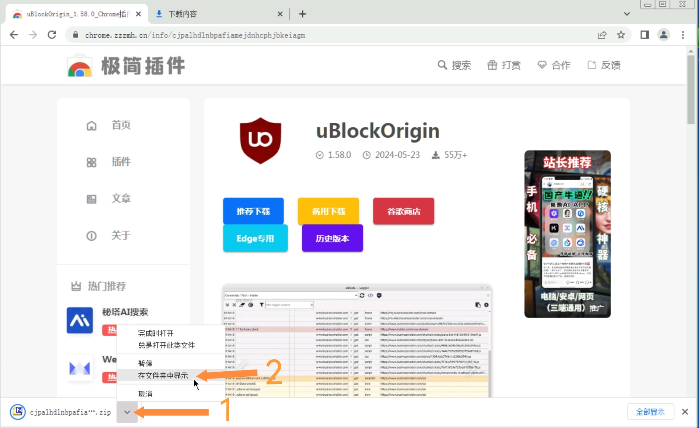 诸如电脑上的 Edge、Firfox,手机上的 狐猴浏览器 等浏览器,其可以直接从 扩展商店 中下载并安装扩展。