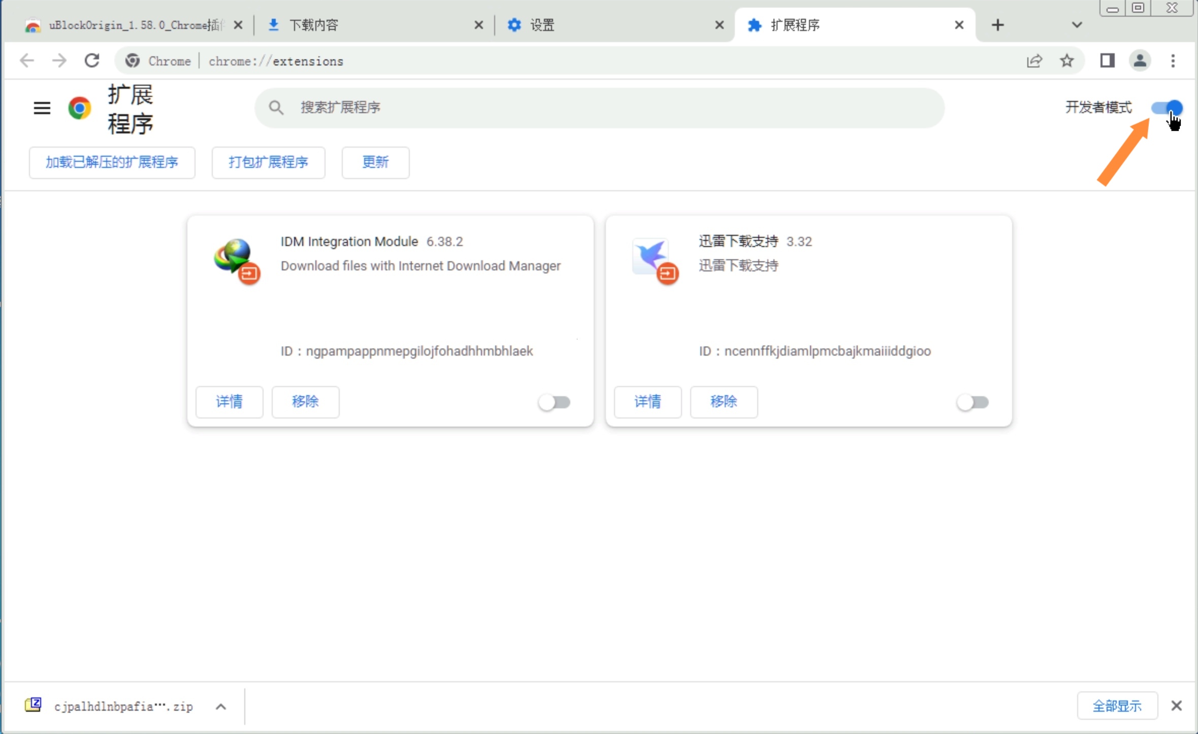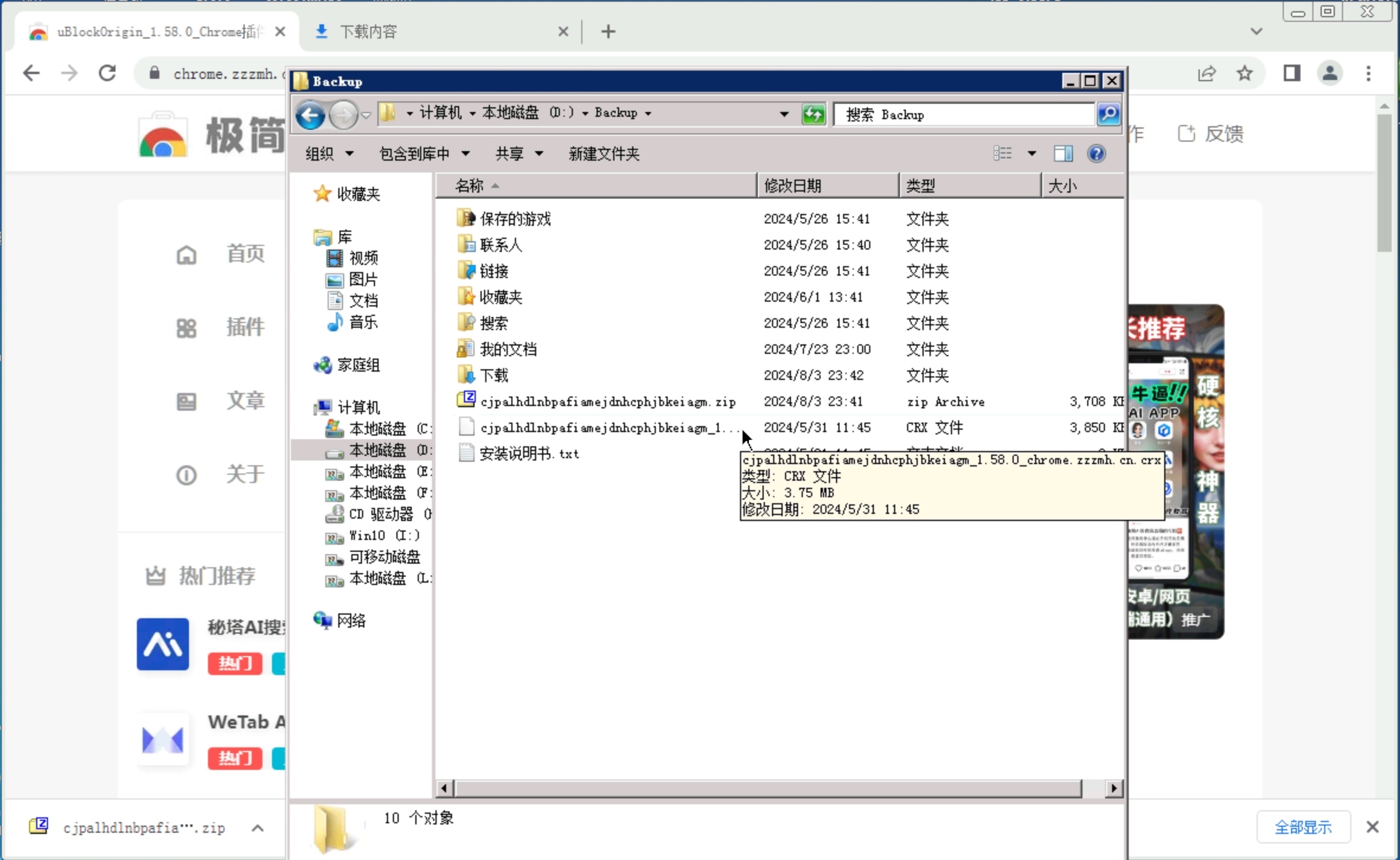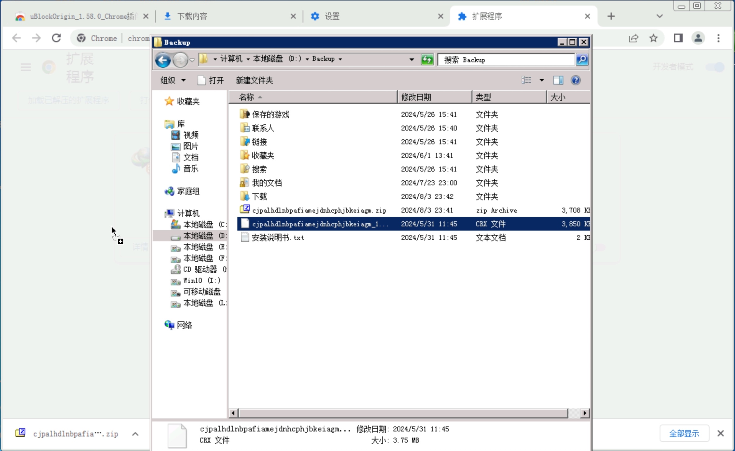回到文件夹,使用鼠标将解压出来的 “.crx”文件 拖动到浏览器的窗口上。