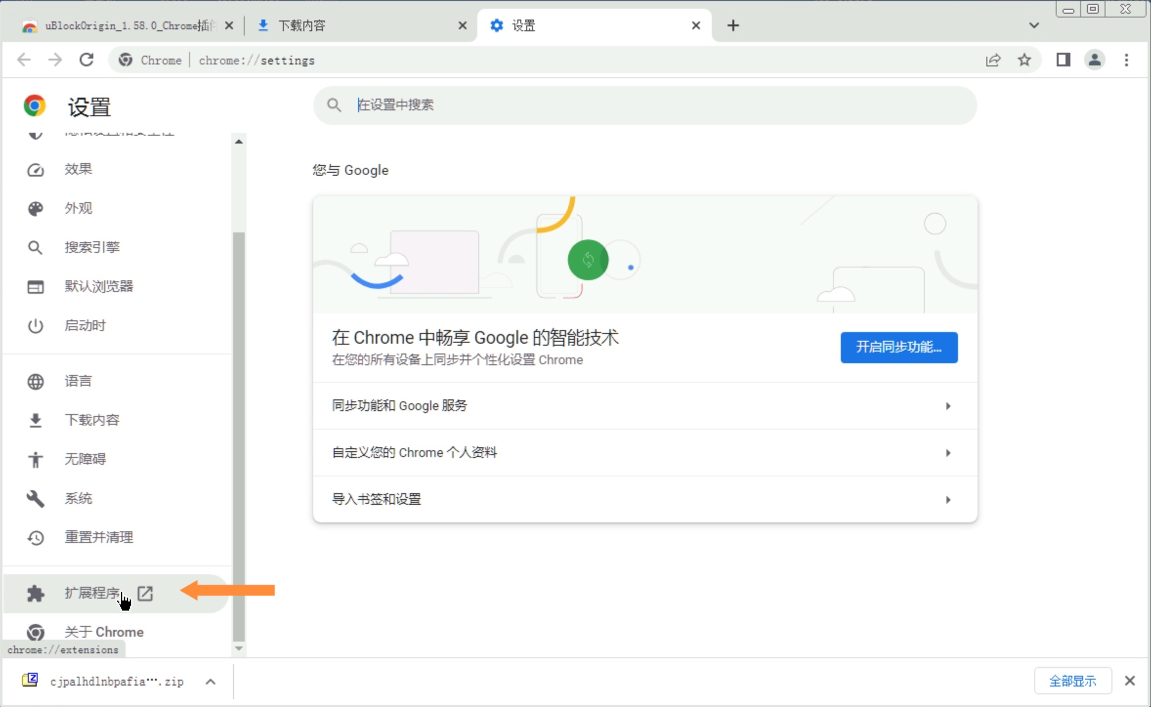 在侧边栏找到 “扩展程序” 并点击,进入新标签页。