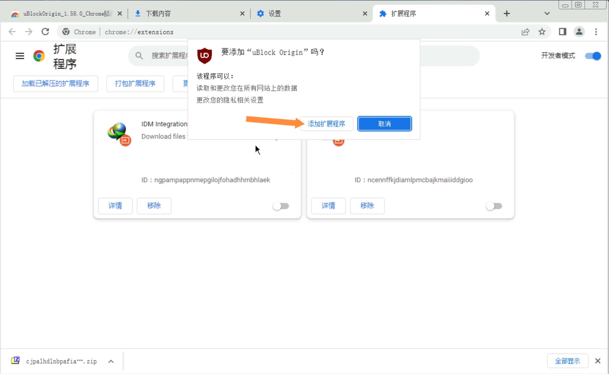等待一下,再点击弹窗中的 添加扩展程序 ,一个扩展就添加好了。