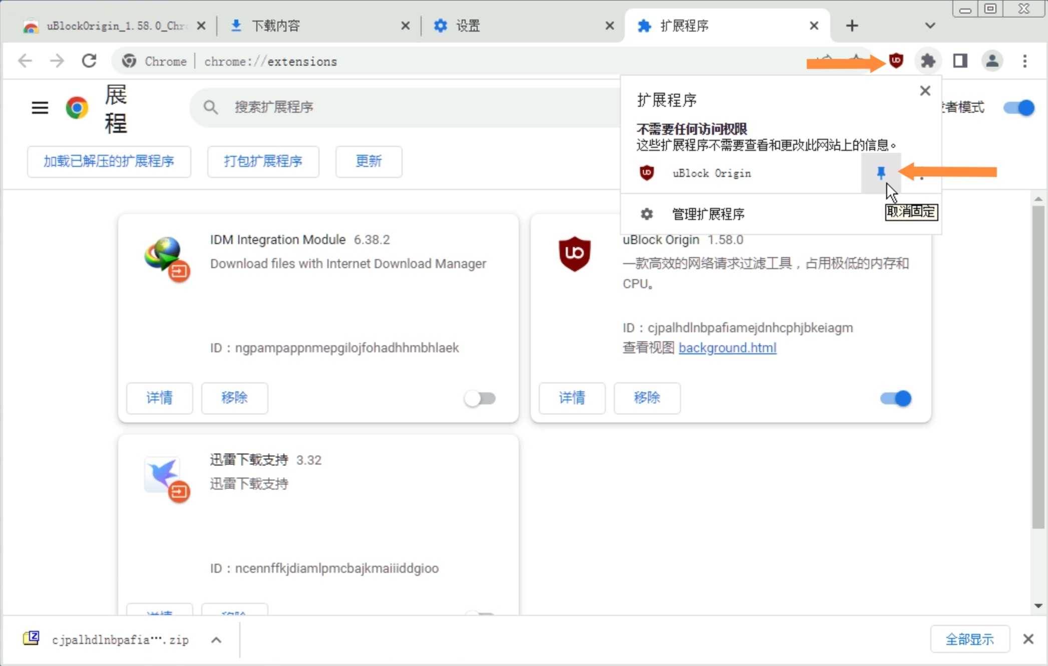 如果你需要频繁使用此插件的窗口,可以点击 插件名字旁边的图钉 按钮。如果图钉直立并为蓝色,则插件的图标就会被 固定在地址栏旁,点击此图标也可以打开插件的窗口。