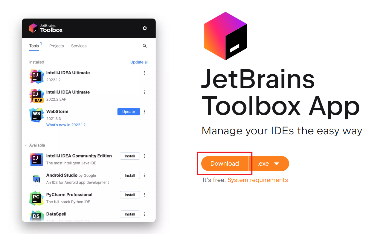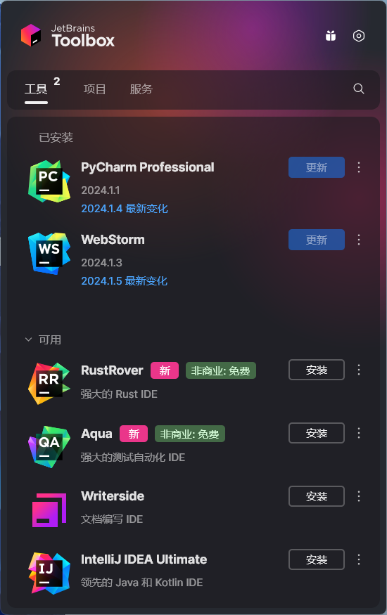 管理以上IDE最方便的方法是使用JetBrains Toolbox App,下面介绍安装和使用方法