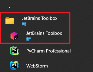 在开始菜单中的 JetBrains Toolbox 文件夹中找到 JetBrains Toolbox 并打开