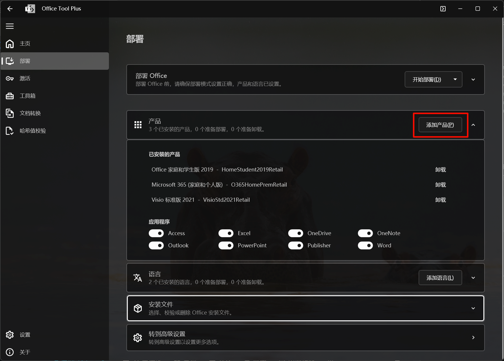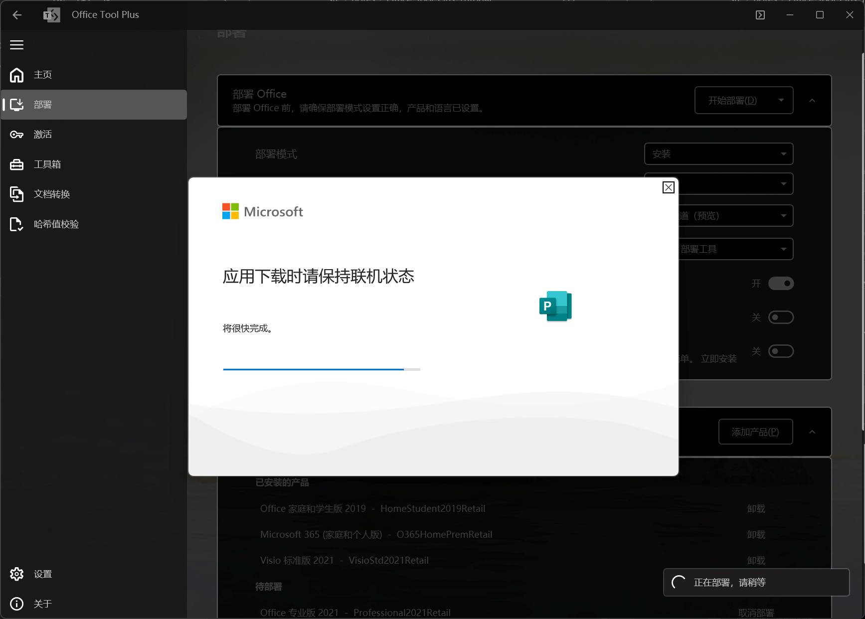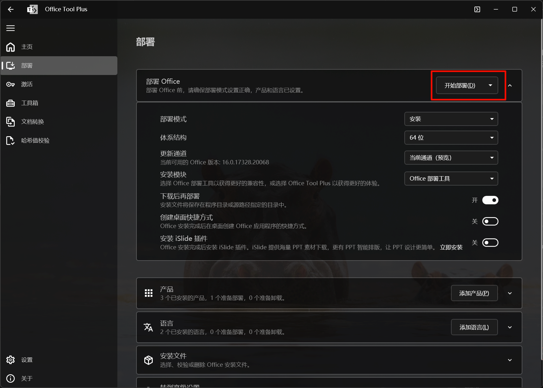 打开 “部署 > 部署 Office”,点击 “开始部署”,下载需要的文件并安装。