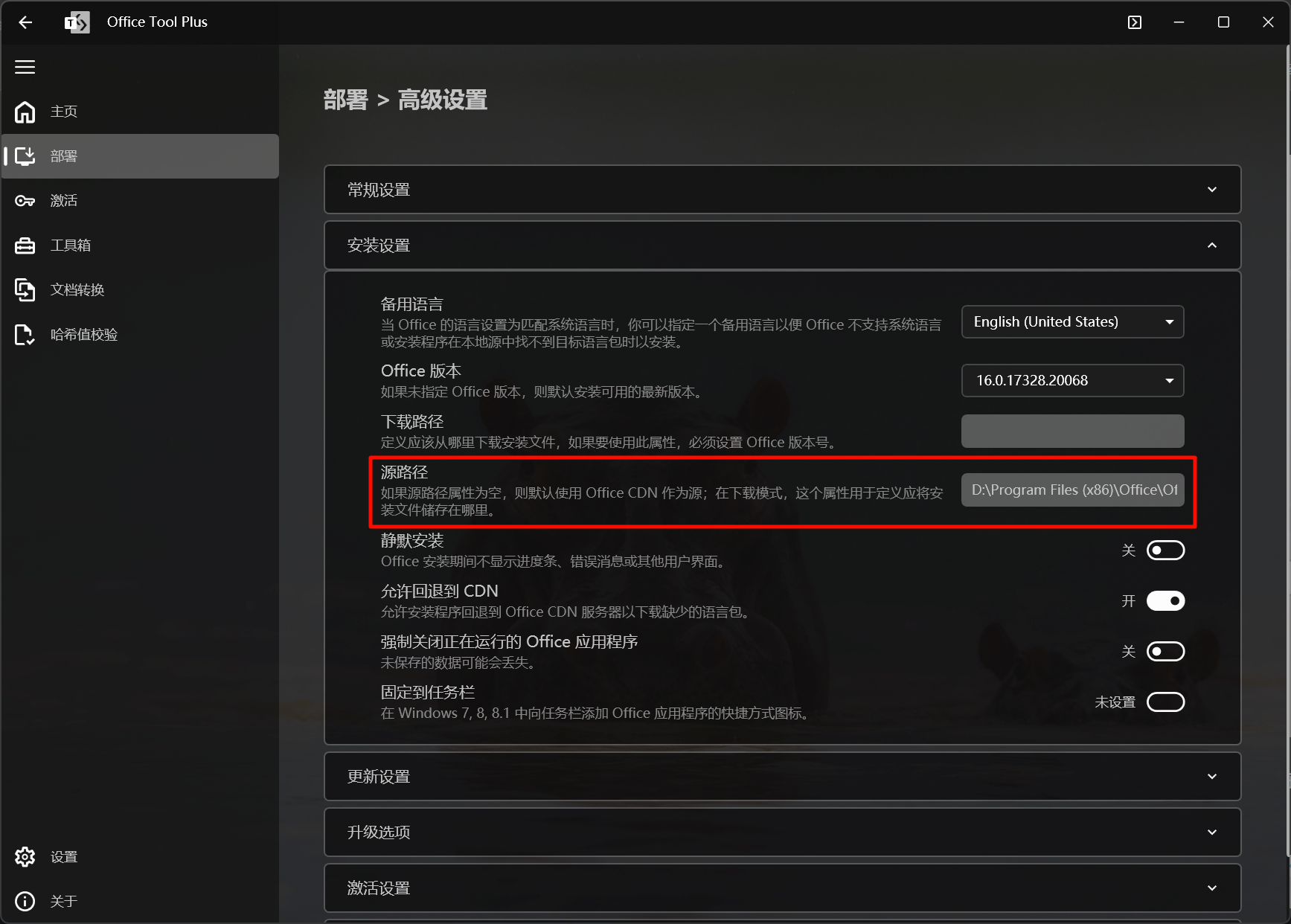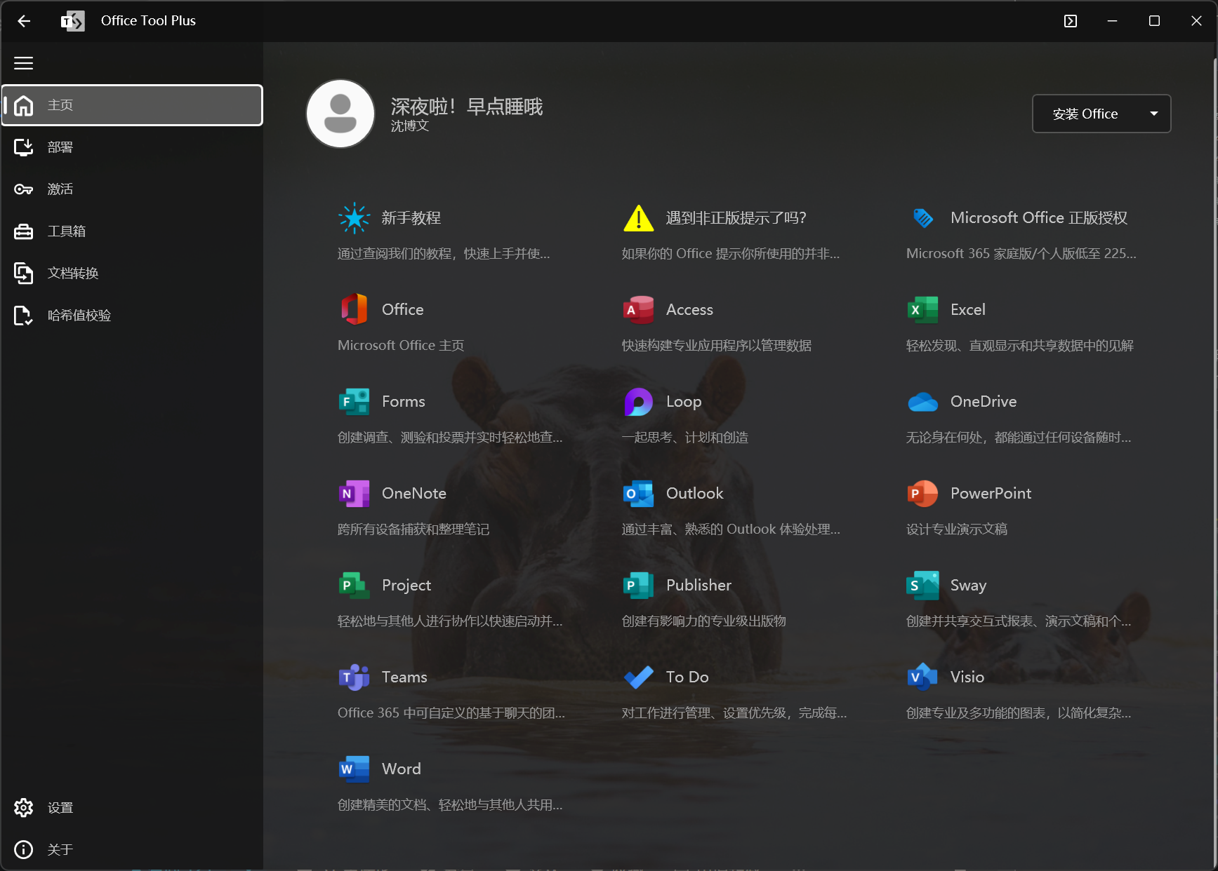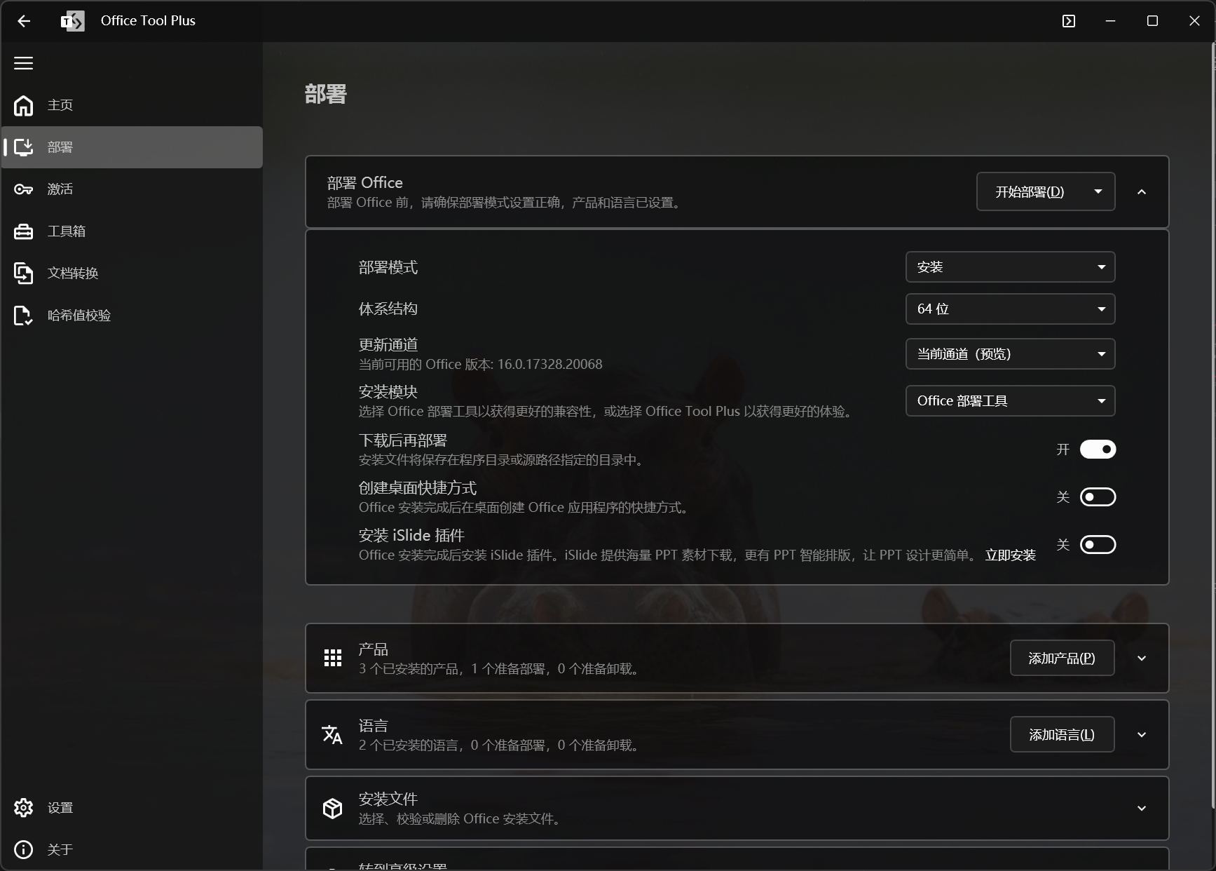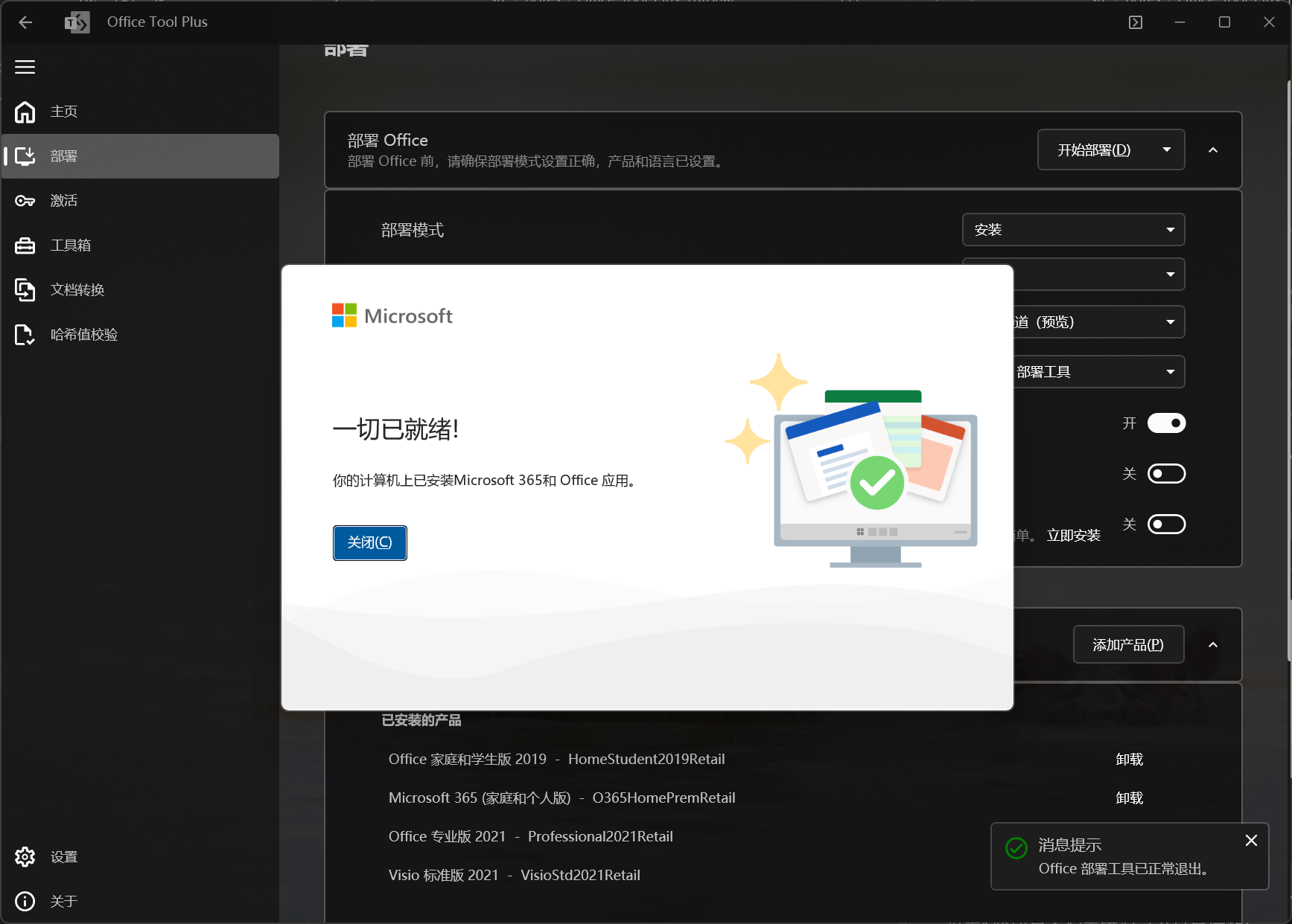 打开 “部署 > 部署 Office”,点击 “开始部署”,下载需要的文件并安装。