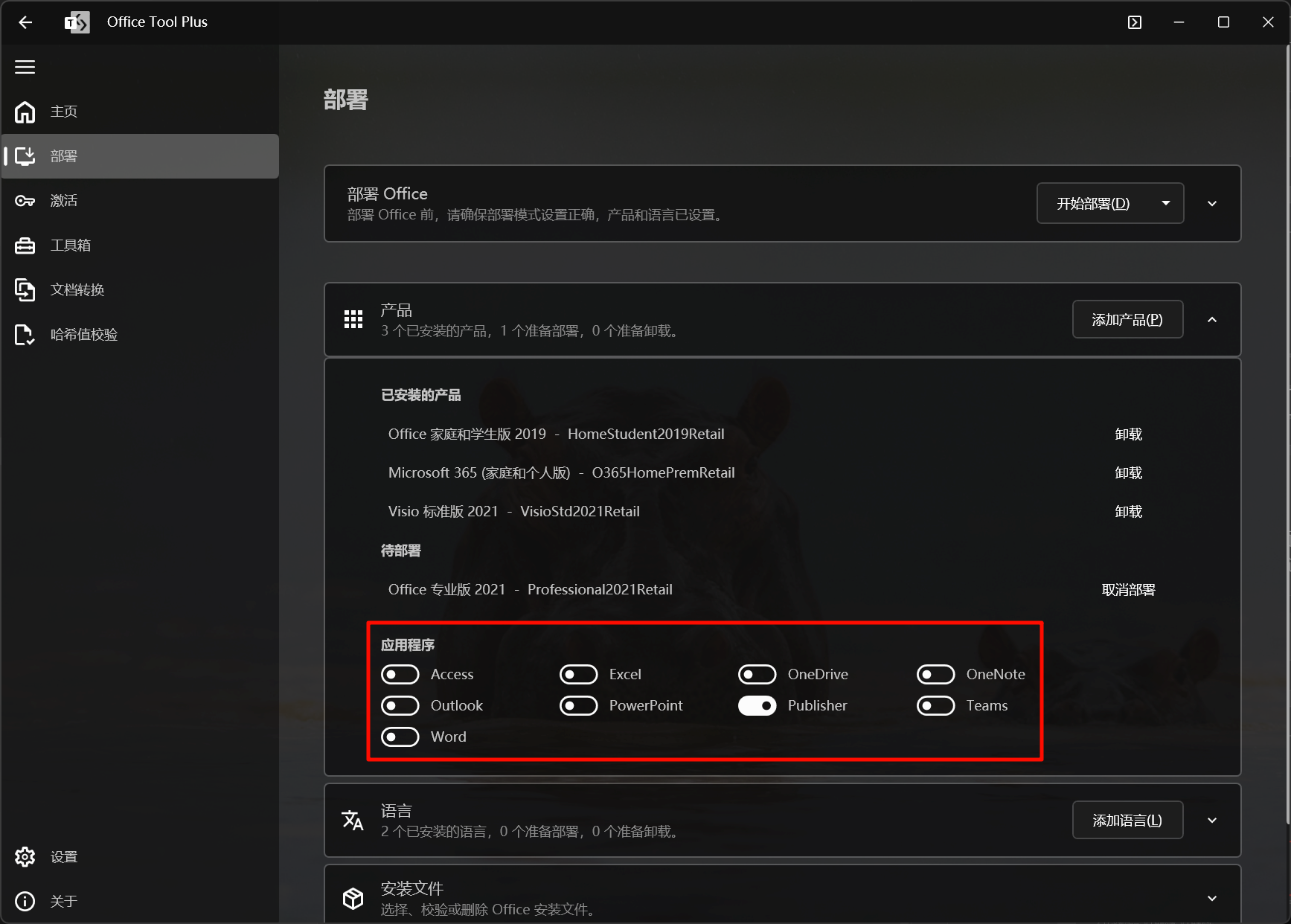 此处我选择的 “Office 专业版 2021”。在下面的 “应用程序” 选择准备安装的应用。例如此处,我为了演示只选择了 “Publisher”