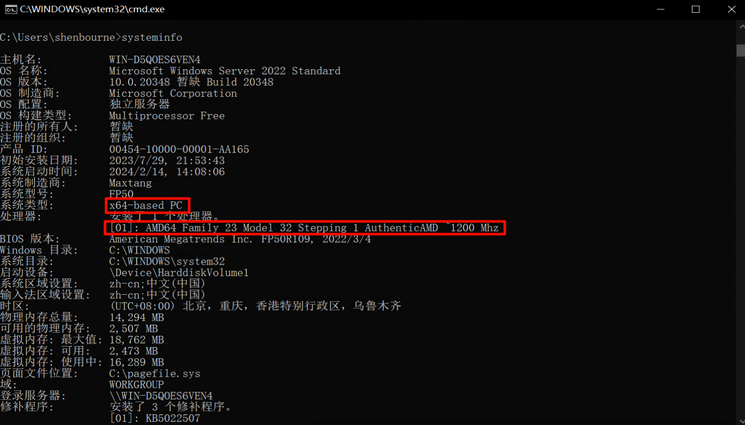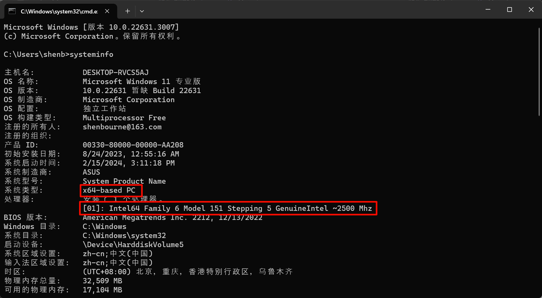systeminfo,等待数秒。查看“系统类型”,若是 “x64-based PC”,则应分辨是哪个指令集架构。amd64 处理器的电脑会输出 “AMD64” 等字样,如图
