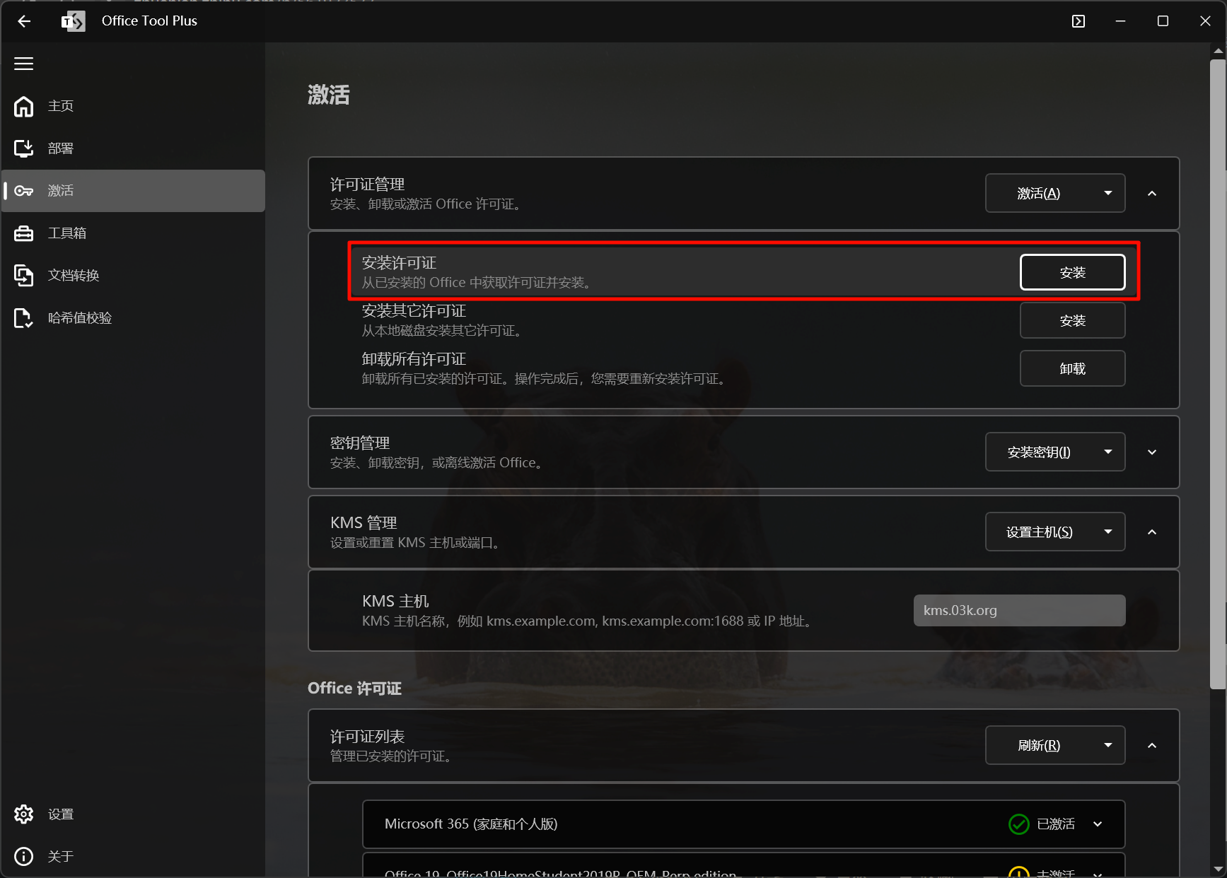 打开 “激活 > 许可证管理”,点击 “安装许可证” 右侧的 “安装” 按钮。