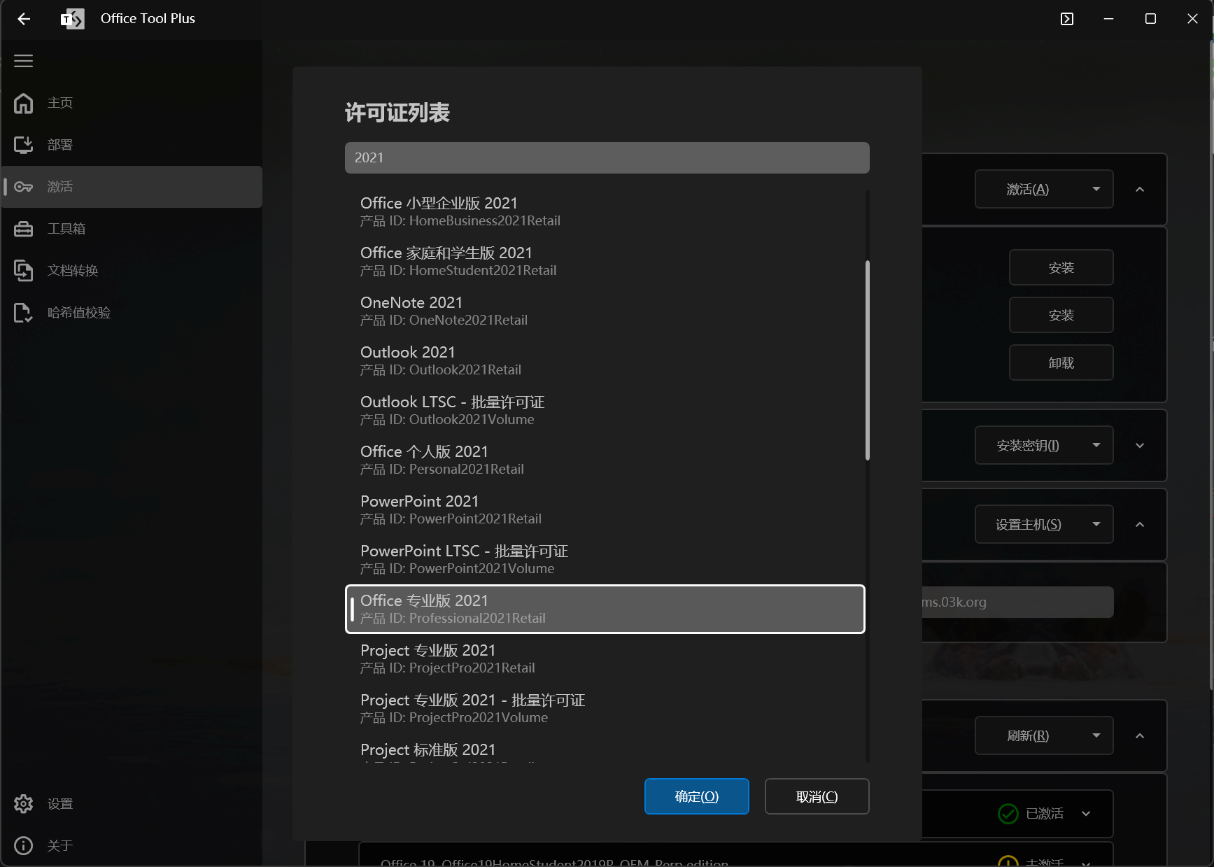 在 “许可证列表” 中选择刚刚安装的版本。例如我刚刚安装的是 “Office 专业版 2021”,则此处我选择“Office专业版2021”