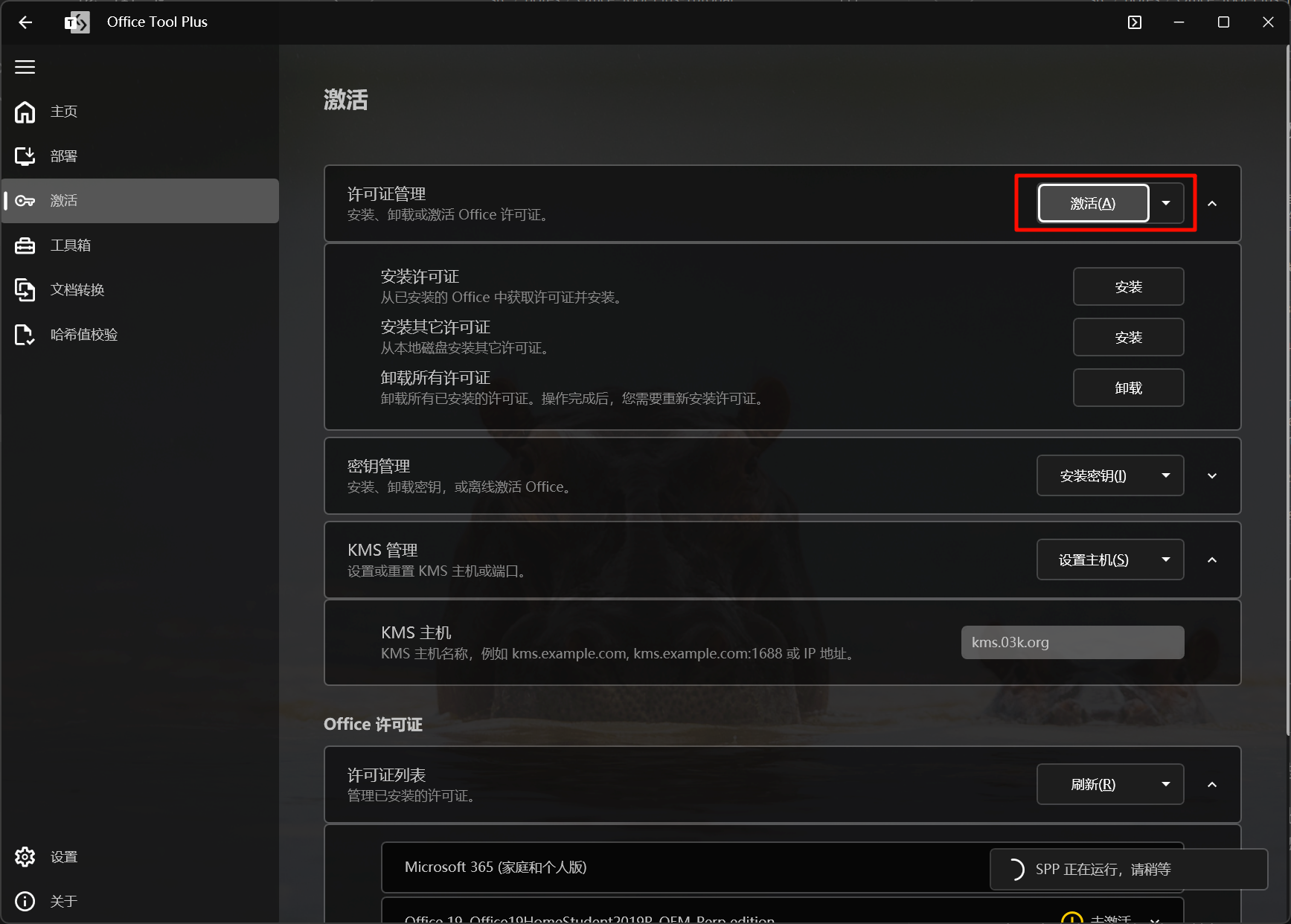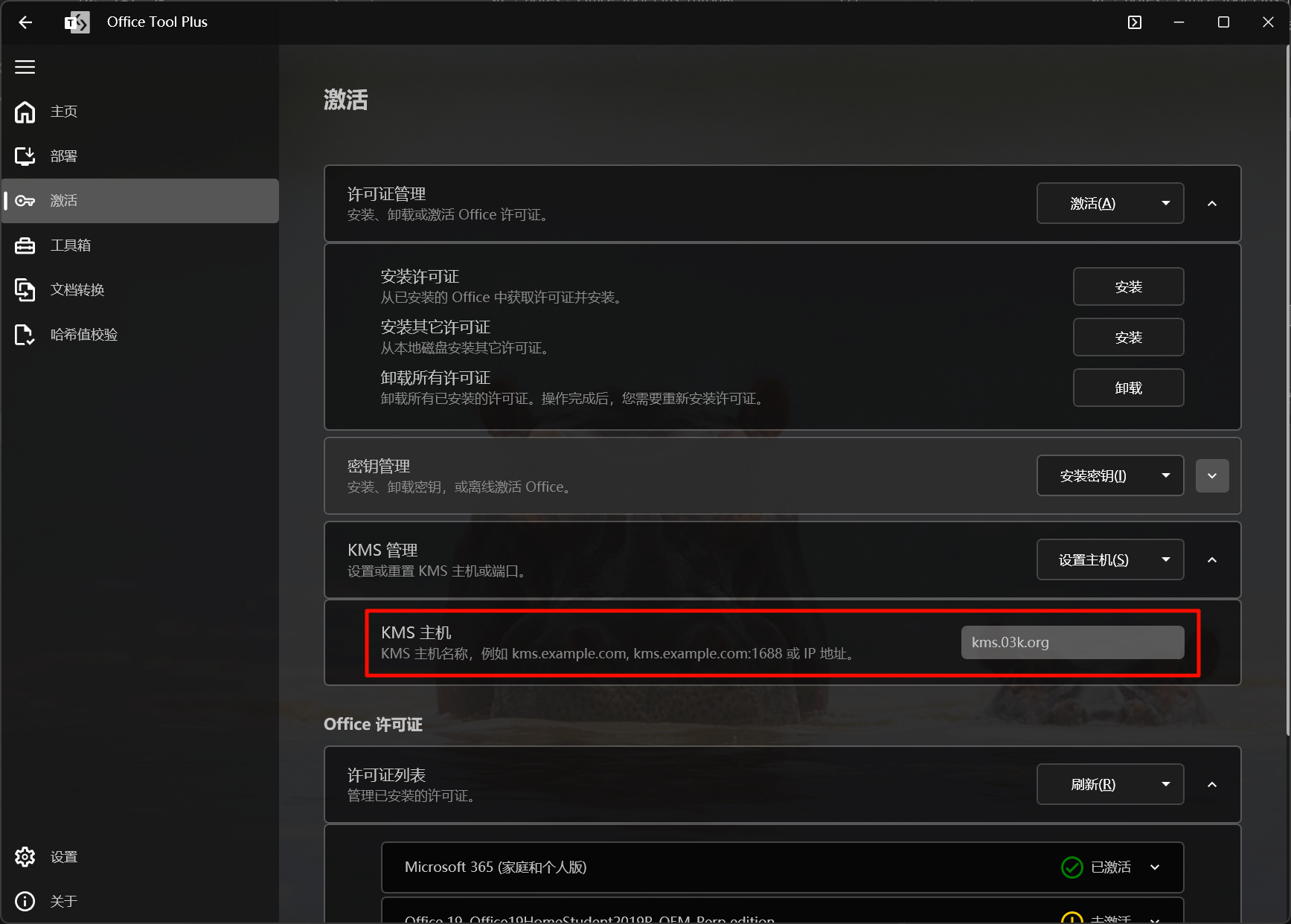 KMS地址的选择可自行决定,在左侧选择一个 KMS 地址,并输入至 Office Tool Plus 中。