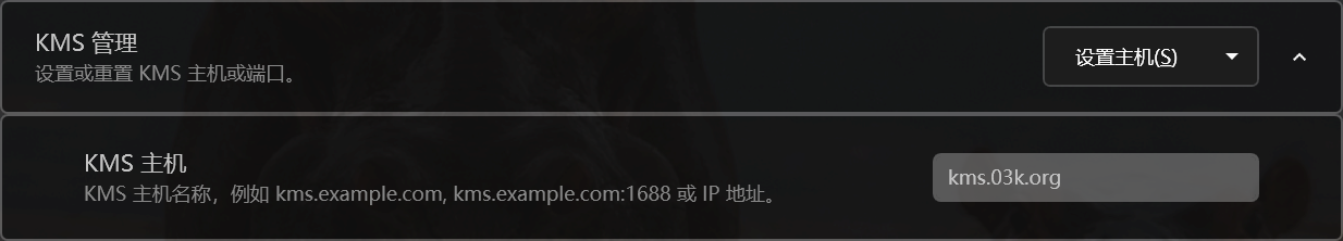 打开 “激活 > KMS 管理”,在 “KMS 主机” 右侧输入 KMS 主机名称。