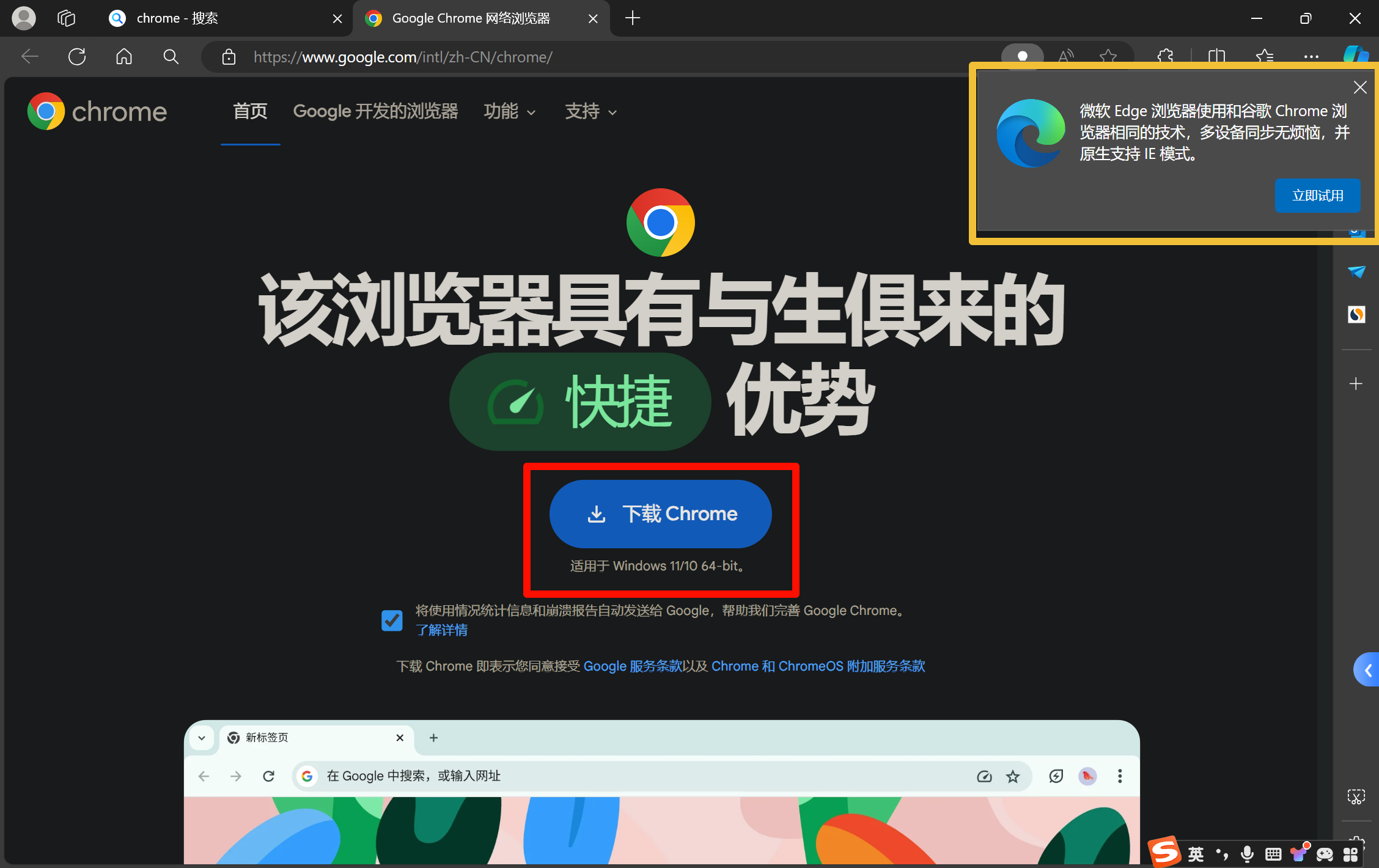 此时你应当忽略左上角被黄色框选的弹窗,而点击被红色框选的 “下载 Chrome” 按钮