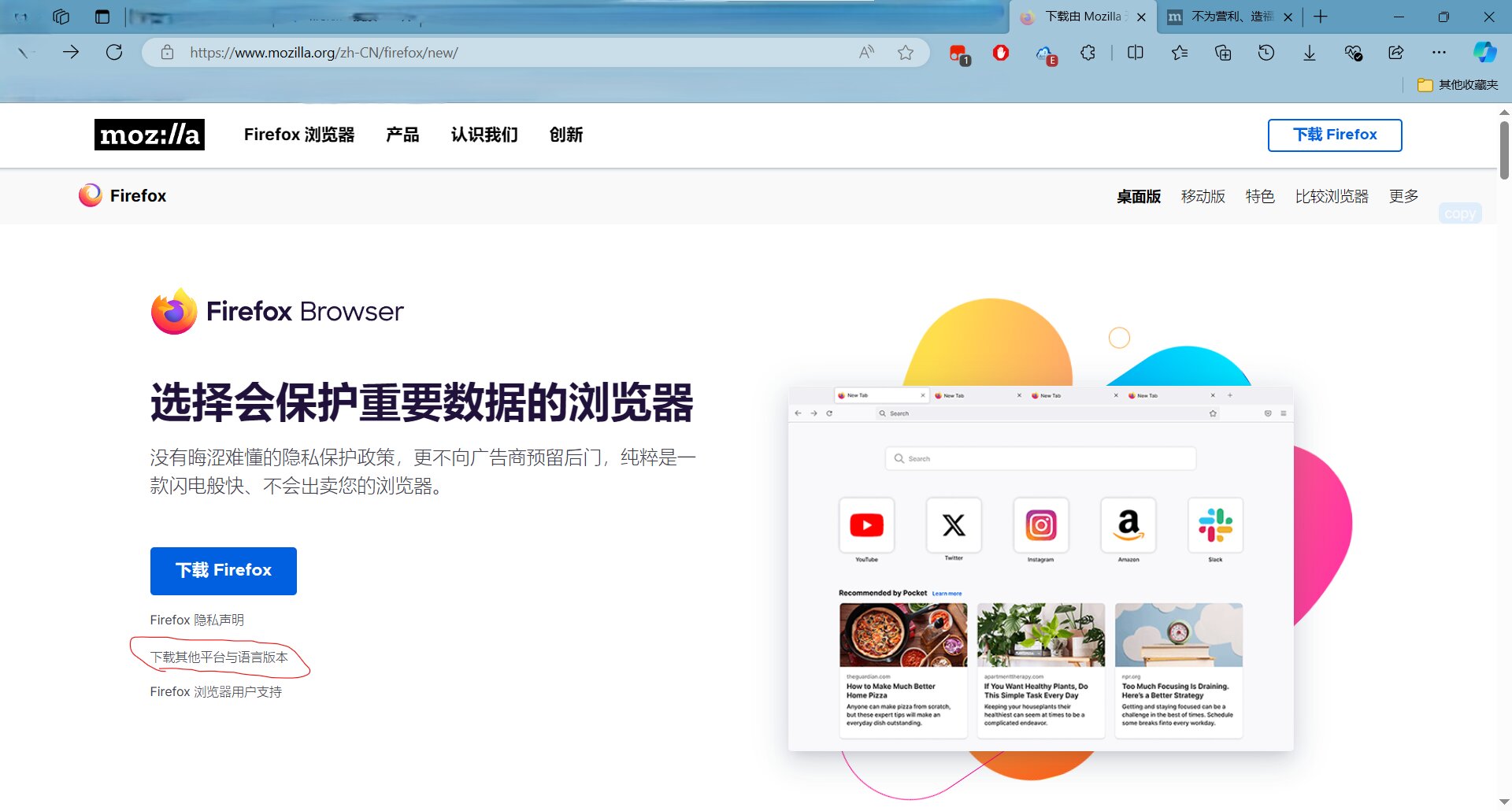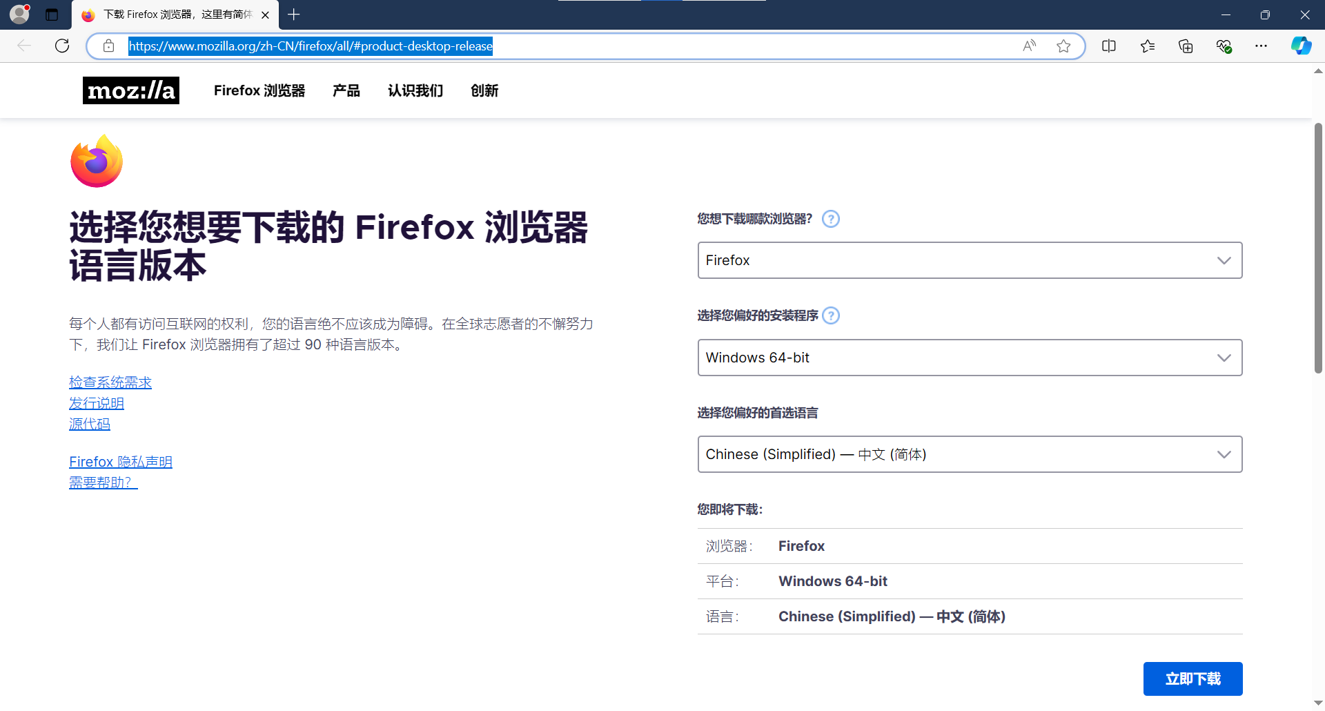 点击“下载其它平台与语言版本”,或直接点击右侧链接( https://www.mozilla.org/zh-CN/firefox/all/ )进入下图界面,选择好版本和语言,点击“立即下载”下载。