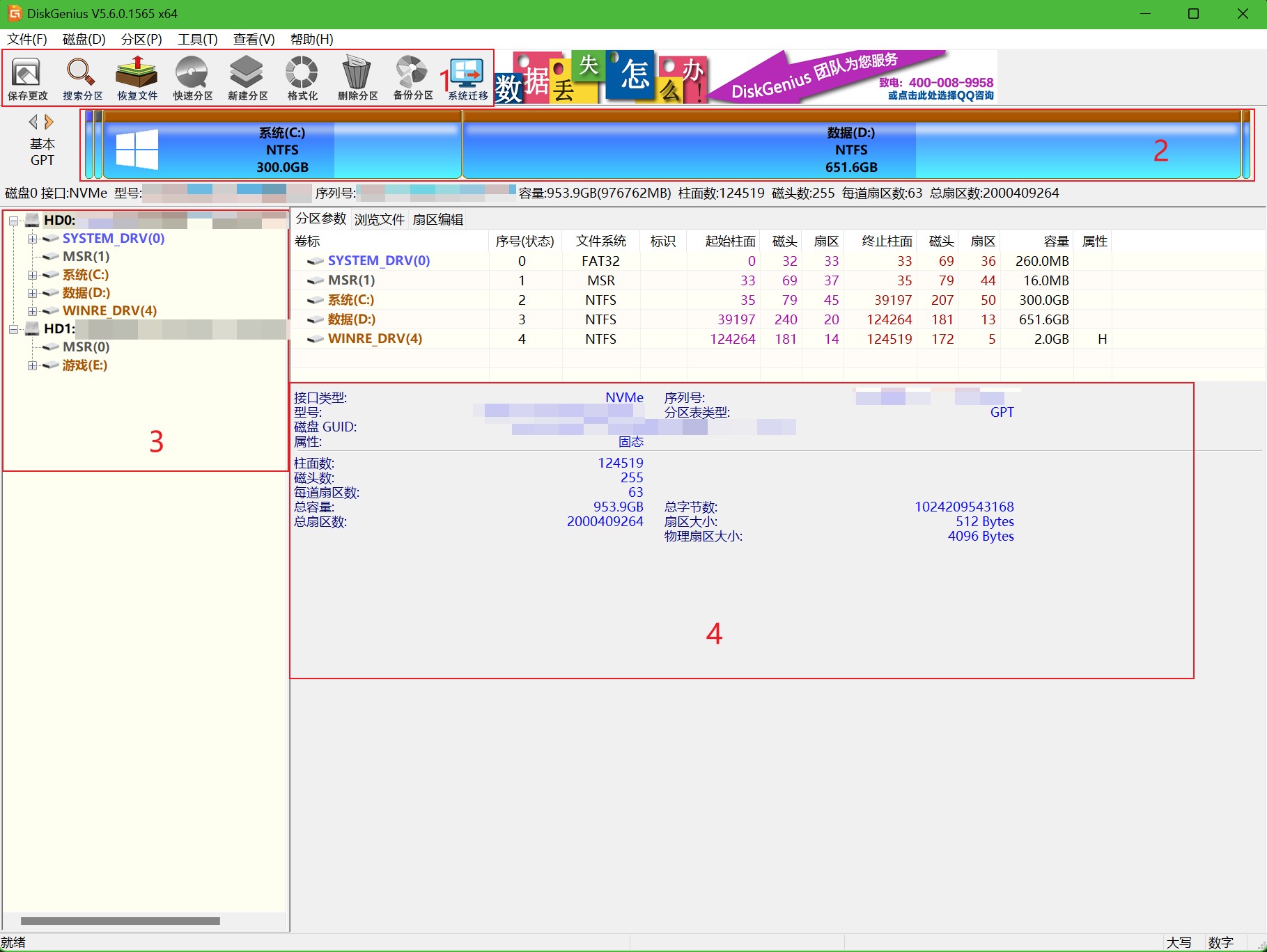 - 磁盘(分区)信息区:显示了当前磁盘(分区)的详细信息,包括磁盘型号、容量等。