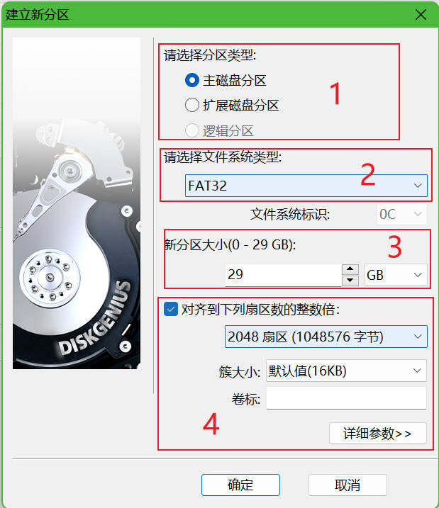区域1中选择“主磁盘分区”,区域2中可以根据自身需要选择不同的文件系统2,区域3可以根据自身需要输入想要的分区大小,区域4中参数一般保持默认。