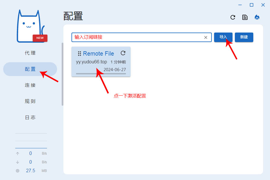 点开右侧的“配置”,在”配置文件链接”输入框中填入提供的订阅链接,单击“导入”。