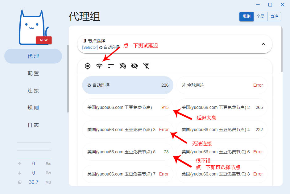 单击一个节点,此时Clash Nyanpasu会使用此节点进行科学上网。