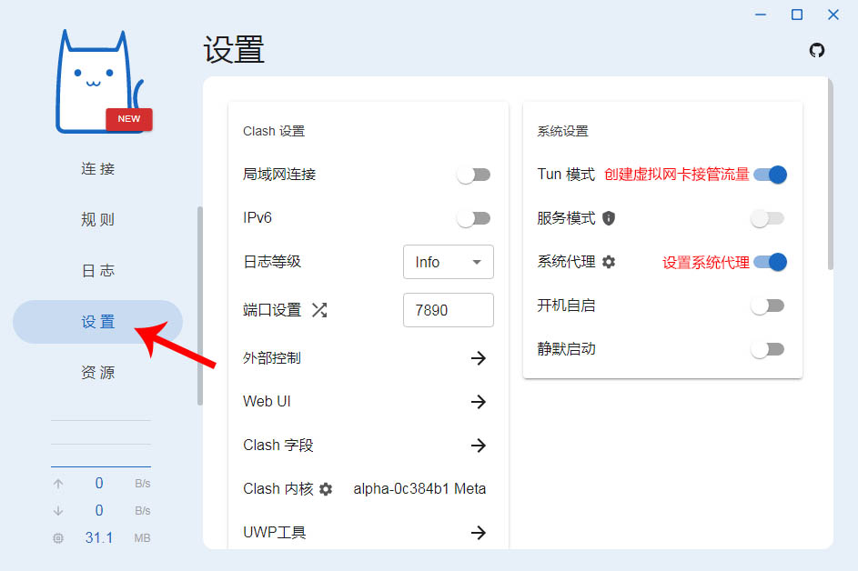 点开右侧的“设置”,打开“系统代理”开关,此时浏览器中的流量都会经过Clash Nyanpasu。