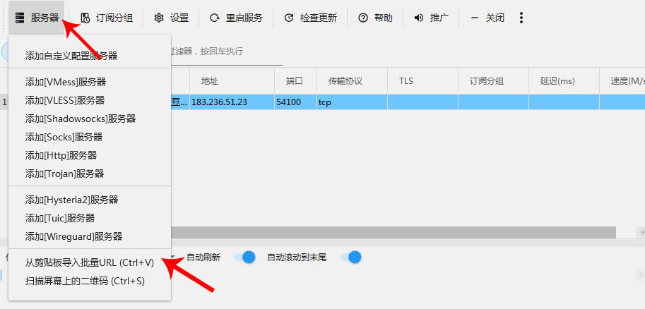 点开v2rayN中的”服务器”,点击“从剪贴板导入批量URL”。