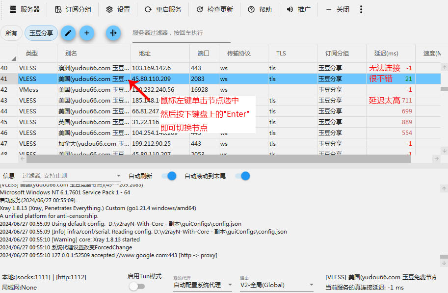 选中一个节点,按下回车键,此时v2ray会使用此节点进行科学上网。