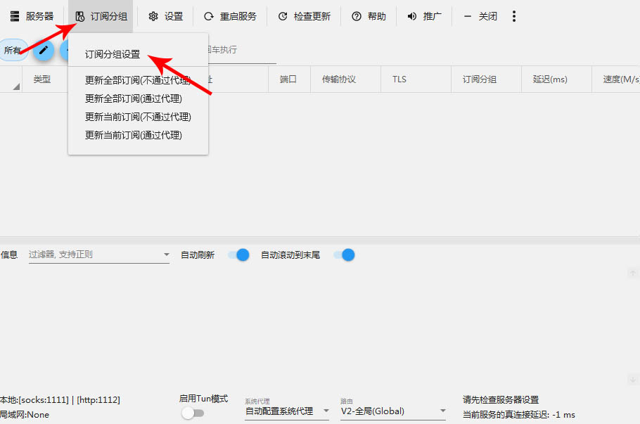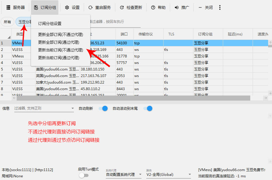再次点开订阅分组,单击“更新当前订阅(不通过代理)”,此时机场提供的节点导入成功。