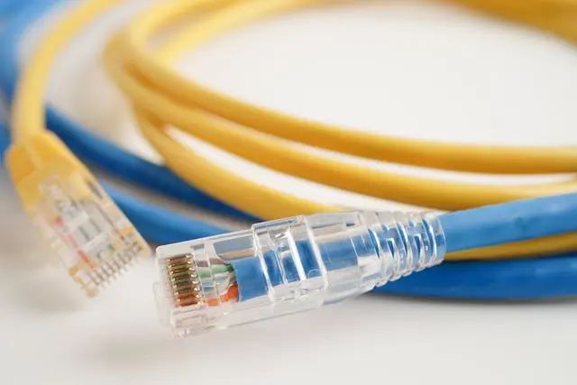 使用一根叫做“网线”的线缆,网线的形状如下所示,两端的透明接头叫做“水晶头”或“RJ45接头”