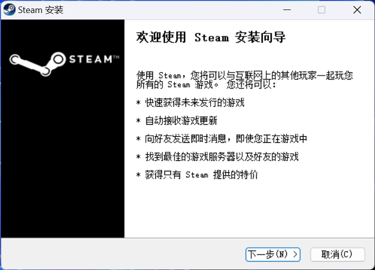 - 下载完成后点击打开(可能会显示‘允许此应用对你的设备进行更改’,请点击 ‘是’ 以进入下一步),进入Steam安装向导,点击 “下一步(N)”(见图2)。