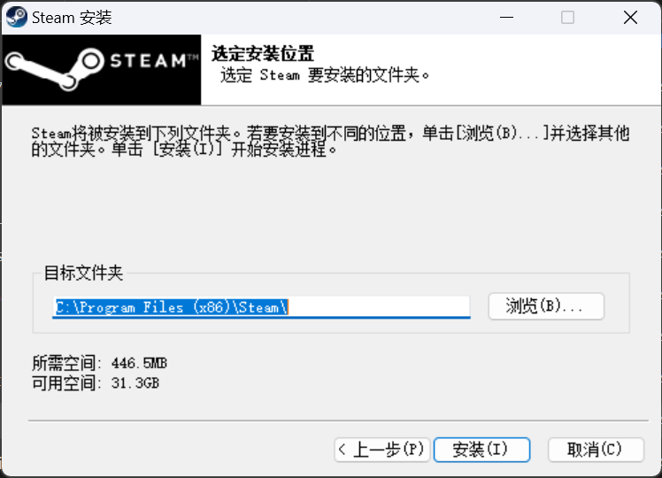 Steam默认会安装在系统盘符(分区),如果你需要更改安装位置,请点击 “ 浏览(B)”以选择你想要其安装的位置。(如果你只有系统盘符或不会修改,请无视此句,直接安装)
