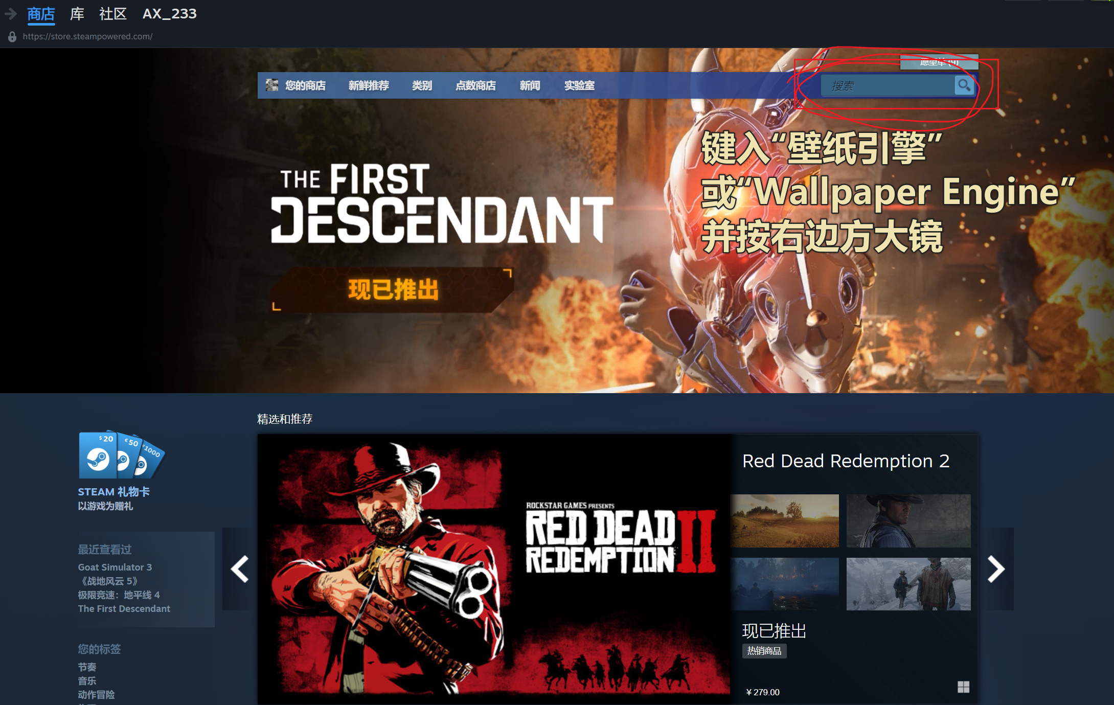 - 进入商店页面后,在页面右上角键入“壁纸引擎”或“Wallpaper Engine”并按回车以开始搜索。