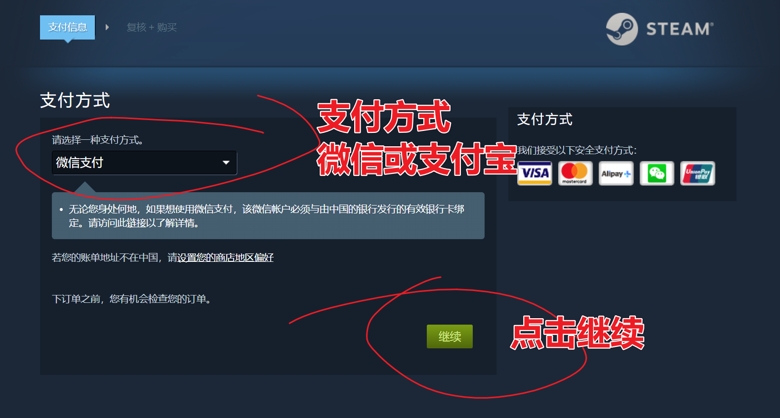 弹出的页面 选择支付方式(国内通常为微信或支付宝)。选择完毕后点击“继续”,Steam会创建支付订单,此时你需要鼠标移至 白色方格 并单击鼠标左键以 勾选用户协议 ,勾选完毕后鼠标移至 “跳转至微信支付”(或者支付宝),单击鼠标左键。