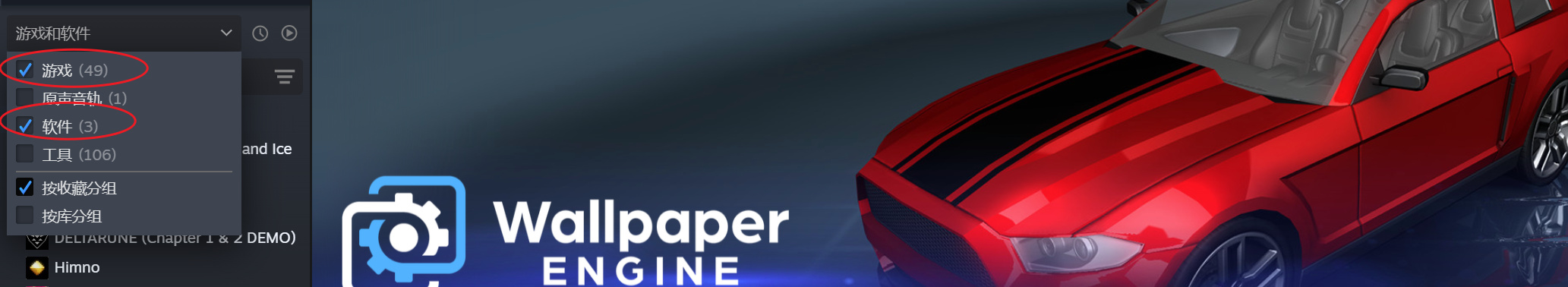 - 随后你可以移动鼠标至屏幕左上角的“库”,单击鼠标左键,在“主页”下方的按钮可选择显示的类别,届时你会在左边栏看到你刚刚购买的《Wallpaper Engine:壁纸引擎》,如图: