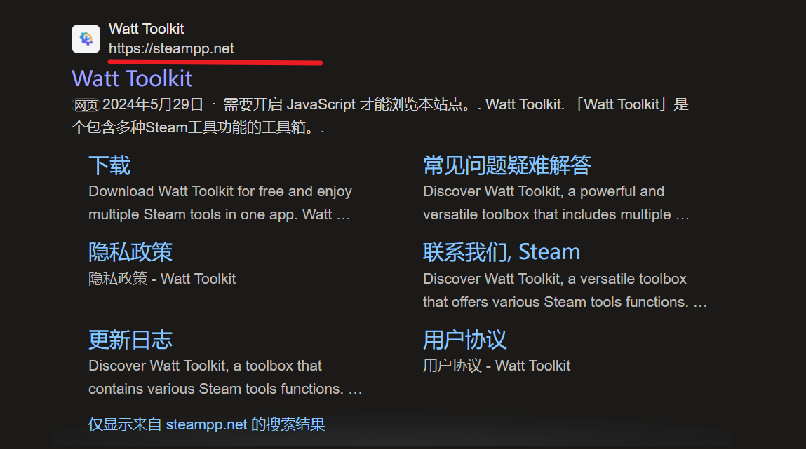 - 按照上文查找Steam一样,依葫芦画瓢,在浏览器搜索栏键入“Watt Toolkit”并按下键盘的回车键搜索 ,找到其官网并用鼠标左键点击以跳转。(也可以点击上面的官网链接来跳转)